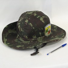 CHAPÉU (TAM 59) COM ESTAMPA DE CAMUFLAGEM DO EXÉRCITO, NAS CORES VERDE E MARROM. POSSUI BROCHE EM PLÁSTICO TRANSPARENTE, COM O BRASÃO DO 'BATALHÃO SERIDÓ' DE 'CAICÓ-RN'.
