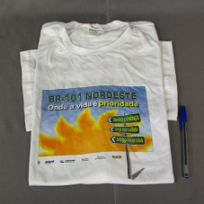 CAMISETA (TAM G) EM MALHA BRANCA, DE MANGA CURTA. NA FRENTE, ESTAMPA EM AZUL COM AMARELO, MOSTRANDO O SOL, E A INSCRIÇÃO ' BR-101 NORDESTE / ONDE A VIDA É PRIORIDADE / OBEDEÇA A SINALIZAÇÃO / DIRIJA COM CUIDADO / EVITE JOGAR LIXO NA RODOVIA'. ABAIXO, NOMES DAS INSTITUIÇÕES GOVERNAMENTAIS. ATRÁS, 'FÉRIAS COM SEGURANÇA'.