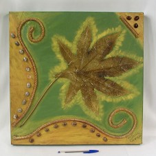 PINTURA SOBRE TELA (50X50 CM), COM FUNDO EM TONS DE VERDE E DOURADO. POSSUI UMA FOLHA SECA E GRANDE COLADA NO CENTRO, E LATERAIS ORNADAS COM SEMENTES E CORDAS DE SISAL. NO CANTO INFERIOR DIREITO, ASSINATURA DA ARTISTA, 'GLEICE 20/03/06'.
