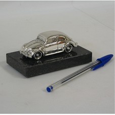 MINIATURA DE FUSCA (8,5X3,5X3 CM) EM METAL PRATEADO, FIXADO EM BASE DE GRANITO PRETO. NA PARTE INFERIOR DO FUSCO, A INSCRIÇÃO 'VOLKSWAGEN 1950'. ACONDICIONADO EM CAIXA DE PAPELÃO BRANCO, COM LOGOMARCA DA VOLKSWAGEN NA TAMPA.