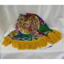 ESPÉCIE DE CAPA FOLCLÓRICA, COM FRANJAS EM LÃ AMARELA. POSSUI TRÊS ESTRELAS BORDADAS EM LANTEJOULAS COLORIDAS, ORNADAS COM OUTRAS LANTEJOULAS E MIÇANGAS.