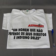 CAMISETA (TAM G) EM MALHA BRANCA, DE MANGA CURTA. NA FRENTE, ESTAMPA COM A INSCRIÇÃO 'UM HOMEM QUE NÃO DEFENDE OS SEUS DIREITOS É INDIGNO DELES', POSSUI NOME E LOGOMARCA DA 'ASSOJURIS / ASSOC. DOS SERVIDORES DO PODER JUDICIÁRIO DO EST. DE SP'. ATRÁS, MESMA LOGOMARCA E 'SERVIDORES DO JUDICIÁRIO PAULISTA EM DEFESA DE SEUS DIREITOS TRABALHISTAS'.