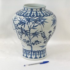 JARRO/VASO DECORATIVO (31 CM), EM PORCELANA BRANCA, COM PINTURA EM TONS DE AZUL, DE MOTIVOS FLORAIS, DE BAMBUS E AMEIXAS. POSSUI BOJO SUPERIOR ABAULADO E BASE MAIS ESTREITA. RÉPLICA DE UMA PEÇA DO SÉCULO XV. ACOMPANHA FOLHETO COM DESCRIÇÃO DA OBRA. ACONDICIONADA EM ESTOJO DE MADEIRA CLARA.