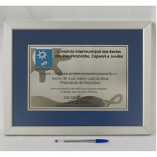 MÉRITO AMBIENTAL CONSÓRCIO PCJ. PLACA (19X28,5 CM) EM AÇO ESCOVADO, CONTENDO A INSCRIÇÃO 'CONSÓRCIO INTERMUNICIPAL DAS BACIAS DOS RIOS PIRACICABA, CAPIVARI E JUNDIAÍ / CONCEDE O CERTIFICADO DO MÉRITO AMBIENTAL CONSÓRCIO PCJ AO EXMO. SR. LUIZ INÁCIO LULA DA SILVA / PRESIDENTE DA REPÚBLICA / PELA PRIORIZAÇÃO DE POLÍTICAS PÚBLICAS VOLTADAS À GESTÃO DOS RECURSOS HÍDRICOS. / JOSÉ ROBERTO FUMACH / PREFEITO DE ITATIBA E PRESIDENTE DO CONSÓRCIO PCJ / CAMPINAS, 02 DE FEVEREIRO DE 2007'. FIXADA EM MOLDURA (33X42,5 CM) DE ALUMÍNIO FOSQUEADO, COM TAMPO DE VIDRO E PASSE-PARTOUT AZULADO.