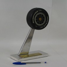 ESCULTURA COMEMORATIVA, NO FORMATO DE UM PNEU (10X5 CM), EM BORRACHA PRETA E RODA METÁLICA, POSSUINDO A INSCRIÇÃO 'BRIDGESTONE / POTENZA'. FIXADO EM SUPORTE METÁLICO, E ESTE EM BASE DE MESMO MATERIAL, ONDE HÁ PLACA DOURADA CONTENDO A GRAVAÇÃO 'Á SUA EXCIA. SR. PRESIDENTE DA REPÚBLICA LUIZ INÁCIO LULA DA SILVA / PELA INAUGURAÇÃO DA BRIDGESTONE DA BAHIA / CAMAÇARI, 2 DE FEVEREIRO DE 2007'. NA PARTE FRONTAL DA BASE, ASSINATURA DA ARTISTA 'YONE DI ALERIU'.