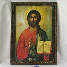 QUADRO (77,5X57,5 CM) COM MOLDURA EM MADEIRA PINTADA EM CRAQUELÊ EM TONS DE MARROM E BEGE. POSSUI IMAGEM IMPRESSA (68,5X48,5 CM), DE UMA PINTURA QUE REPRESENTA JESUS CRISTO SEGURANDO UM LIVRO ABERTO.