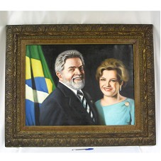 QUADRO (89X108 CM) COM MOLDURA EM MADEIRA TRABALHADA COM MOTIVOS FLORAIS. EMOLDURA PINTURA SOBRE TELA (58,5X78,5 CM) RETRATANDO O PRESIDENTE LULA E A PRIMEIRA-DAMA MARISA, LADO A LADO, COM A BANDEIRA DO BRASIL AO LADO DO PRESIDENTE. PINTURA COM FUNDO PRETO, PREDOMINANDO TONS ESCUROS.