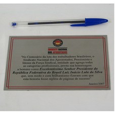 PLACA (10X15 CM) EM AÇO ESCOVADO, CONTENDO A INSCRIÇÃO 'SINDICATO NACIONAL DOS APOSENTADOS / NO CENTENÁRIO DA LUTA DOS TRABALHADORES BRASILEIROS, O SINDICATO NACIONAL DOS APOSENTADOS, PENSIONISTAS E IDOSOS DA FORÇA SINDICAL, ENTIDADE QUE AGREGA TODAS AS CATEGORIAS PROFISSIONAIS, PRESTA SUA HOMENAGEM A HOMENS COMO EXCELENTÍSSIMO SENHOR PRESIDENTE DA REPÚBLICA FEDERATIVA DO BRASIL LUIZ INÁCIO LULA DA SILVA QUE, SEM MEDO E COM BRILHANTISMO FIZERAM COM QUE ESTA HISTÓRIA FOSSE REPLETA DE PÁGINAS DE SUCESSO / JANEIRO/2007'. ACONDICIONADA EM ESTOJO FORRADO DE VELUDO AZUL MARINHO.