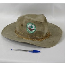 CHAPÉU EM BRIM MARROM-ESVERDEADO. NUMA DAS LATERAIS, BORDADO COM A INSCRIÇÃO 'BARCO ESCOLA DA NATUREZA' E LOGOMARCA.