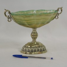 BOMBONIERE E/OU PETISQUEIRA (16X24,5X10 CM) COM PÉ EM PRATA TRABALHADA, POSSUINDO DUAS PEQUENAS ALÇAS NAS LATERAIS. POSSUI COPO EM VIDRO COM ESPESSURA ONDULADA, LEMBRANDO UMA CONCHA MARINHA, EM TONALIDADES DE VERDE E BEGE, E FUNDO TRANSPARENTE. NA BASE, A GRAVAÇÃO 'PRESIDENTE DE LA REPUBLICA ARGENTINA Y SEÑORA'. ACONDICIONADA EM ESTOJO FORRADO DE COURO PRETO.