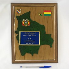 PLACA EM MADEIRA 30X23 CM), ONDE HÁ COLADO O MAPA DA BOLÍVIA, EM MESMO MATERIAL, PINTADO DE VERDE. NELE, PLACA METÁLICA COM A INSCRIÇÃO 'LA DIRECCIÓN NACIONAL M.A.S - I.P. S. P. FELICITA EN SU XXVII ANIVERSARIO AL: P.T. / EVO MORALES A. / PRESIDENTE CONSTITUCIONAL DE LA REPUBLICA DE BOLIVIA / BOLIVIA, FEBRERO 2007'. ACONDICIONADA EM ESTOJO FORRADO DE VELUDO AZUL MARINHO.