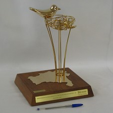 ESCULTURA (26 CM) EM METAL DOURADO, REPRESENTANDO A LOGOMARCA DA 'NESTLÉ' (UM PÁSSARO ALIMENTANDO O FILHOTE NO NINHO), SUSPENSA POR HASTES METÁLICAS, QUE SURGEM DA REGIÃO DE 'FEIRA DO SANTANA', IDENTIFICADA NO MAPA DO BRASIL, EM PLACA DOURADA, FIXADA EM BASE DE MADEIRA (21X21X4 CM). NA PARTE FRONTAL DA BASE, PLACA METÁLICA COM A INSCRIÇÃO 'INAUGURAÇÃO DA NOVA FÁBRICA DA NESTLÉ EM FEIRA DE SANTANA-BA / FEVEREIRO/2007'. POSSUI PEQUENA PLACA COM ASSINATURA DO ARTISTA 'ELIFAS ANDREATO'. ACONDICIONADA EM ESTOJO DE MADEIRA, COM ALÇA.