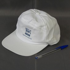 TRÊS BONÉS IGUAIS, EM BRIM BRANCO. NA FRENTE, ESTAMPA EM AZUL, COM A LOGOMARCA DA 'NESTLÉ' E A INSCRIÇÃO 'GOOD FOOD, GOOD LIFE'.