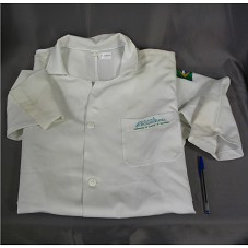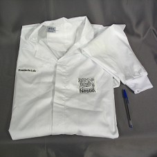 JALECO (TAM 60) COMPRIDO, COM MANGAS LONGAS, EM TECIDO BRANCO. NA FRENTE, DO LADO ESQUERDO, BORDADO EM PRETO 'PRESIDENTE LULA'; DO LADO DIREITO, 'NESTLÉ' E LOGOMARCA.