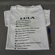 CAMISETA EM MALHA BRANCA, DE MANGA CURTA. NA FRENTE, EM TOM DE VERDE, ACRÓSTICO COM O NOME DO PRESIDENTE, TENDO AO LADO UMA ASSINATURA (NÃO IDENTIFICADA). ATRÁS, BANDEIRA DO BRASIL, COM A INSCRIÇÃO 'BRASIL UM PAÍS DE TODOS'.