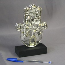 KHAMSA (18X11 CM), MÃO ESTILIZADA UTILIZADA COMO AMULETO PARA PROTEÇÃO, DA CULTURA JUDAICA, CONFECCIONADA EM PRATA 925, COM DETALHES DOURADOS. FIXADA EM BASE DE MADEIRA PINTADA DE PRETO. POSSUI, NAS DUAS FACES DA MÃO E, EM BAIXO RELEVO, REPRESENTAÇÃO DA ENTRADA DE JERUSALÉM, COM VÁRIOS PRÉDIOS E CONSTRUÇÕES. ACOMPANHA CERTIFICADO DE AUTENTICIDADE. ACONDICIONADA EM CAIXA DE PAPELÃO AZUL, COM ETIQUETA DO FABRICANTE.