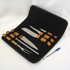 ESTOJO DE COURO (36X15X3,5 CM - MEDIDAS DELE FECHADO) CONTENDO CONJUNTO PARA CHURRASCO, COMPOSTO POR QUATRO FACAS (DUAS GRANDES, UMA MÉDIA E UMA PEQUENA) COM LÂMINAS EM AÇO E CABOS EM MADEIRA; UM GARFO E UM AMOLADOR/AFIADOR. LÂMINAS CONTENDO A INSCRIÇÃO 'BANDO DO BRASIL' E LOGOMARCA. ATRÁS, 'TRAMONTINA SPECIAL LINE'. ACONDICIONADO EM CAIXA DE PAPELÃO, COM A LOGOMARCA DO BANCO NA TAMPA.