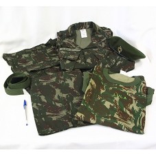 CONJUNTO DE UNIFORME DO EXÉRCITO, EM TECIDO CAMUFLADO VERDE E MARROM, COMPOSTO POR: CALÇA (TAM M) E CINTO, CAMISA DE MANGA COMPRIDA (TAM M), CAMISETA (TAM M) E BOINA (TAM 59). CAMISAS COM O NOME 'LULA' BORDADO. NA BOINA, BÓTON COM BRASÃO DO EXÉRCITO.