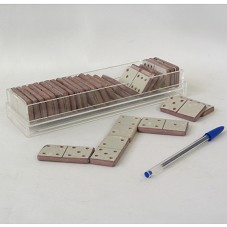 JOGO DE DOMINÓ COMPOSTO POR VINTE E OITO PEÇAS EM PEDRA ARDÓSIA, COM ANVERSO EM COR CLARA E REVERSO ROSEADO. ACONDICIONADO EM ESTOJO (25X7,5X4 CM) DE ACRÍLICO. ESTE, ACONDICIONADO EM CAIXA DE PAPELÃO, TENDO NA TAMPA A INSCRIÇÃO 'ARTESANATO BRASIL COM DESIGN / BRASIL E TESOUROS CULTURAIS / COLEÇÃO CAIXA'.