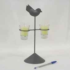 CASTIÇAL (29 CM), PARA DUAS VELAS, EM FERRO PINTADO NA COR GRAFITE, TENDO NA PARTE SUPERIOR UMA POMBA, REPRESENTANDO O DIVINO ESPÍRITO SANTO. ACOMPANHA DOIS COPOS DE CACHAÇA, ONDE ESTÃO MOLDADAS DUAS VELAS NA COR AMARELA. ESTES, FICAM SUSPENSOS E UNIDOS À PEÇA, ILUMINANDO A IMAGEM DA POMBA EM CLAVE MODERNA. ACONDICIONADOS EM CAIXA DE PAPELÃO, TENDO NA TAMPA A INSCRIÇÃO 'ARTESANATO BRASIL COM DESIGN / BRASIL E TESOUROS CULTURAIS / COLEÇÃO CAIXA'.