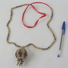 COLAR CONFECCIONADO COM SEMENTES NAS CORES BEGE E MARROM, POSSUINDO PINGENTE DE MESMO MATERIAL. AS DUAS EXTREMIDADES DO CORDÃO ESTÃO COSTURADAS EM FITA DE CETIM VERMELHO.