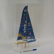 MAQUETE DO VELEIRO 'BRASIL 1', EM ESCALA 1:100, PRIMEIRO BARCO BRASILEIRO A DISPUTAR A A MAIS TRADICIONAL REGATA DE VOLTA AO MUNDO, A 'VOLVO OCEAN RACE'. POSSUI VELAS NAS CORES AZUL E AMARELO, COM LOGOMARCAS DAS INSTITUIÇÕES DE APOIO; CASCO EM AZUL, AMARELO E BRANCO. SUSPENSO POR DUAS HASTES METÁLICAS, FIXADAS EM BASE DE ACRÍLICO. POSSUI REDOMA DE ACRÍLICO. ACONDICIONADA EM CAIXA DE PAPELÃO NAS MESMAS CORES DO BARCO, COM O NOME E DESENHO DO MESMO, E ROTA DA REGATA.