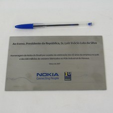 PLACA (12X18 CM) EM AÇO ESCOVADO, CONTENDO A INSCRIÇÃO 'AO EXMO. PRESIDENTE DA REPÚBLICA, SR. LUIZ INÁCIO LULA DA SILVA / HOMENAGEM DA NOKIA DO BRASIL POR OCASIÃO DA CELEBRAÇÃO DOS 10 ANOS DA EMPRESA NO PAÍS E DOS 100 MILHÕES DE CELULARES FABRICADOS NO PÓLO INDUSTRIAL DE MANAUS. MARÇO DE 2007 / NOKIA CONNECTING PEOPLE / 10 ANOS NOKIA BRASIL'. ACONDICIONADA EM ESTOJO FORRADO DE VELUDO AZUL MARINHO.