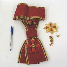 ORDEM DO MÉRITO DA REPÚBLICA FEDERAL DA ALEMANHA, NO GRAU DE GRÃ-CRUZ ESPECIAL, COMPOSTA POR: UMA FAIXA EM TECIDO VERMELHO COM LATERAIS EM LISTRAS AMARELAS E PRETA, POSSUINDO COMO INSÍGNIA UMA CRUZ VERMELHA, TENDO AO CENTRO, MOEDA DOURADA COM DESENHO DE UM FALCÃO DE ASAS ABERTAS; PLACA EM PRATA DOURADA, POSSUINDO MESMA INSÍGNIA; FITA COM MINIATURA DA INSÍGNIA E DA PLACA; E BÓTON COM MINIATURA DA PLACA. ACONDICIONADO EM ESTOJO FORRADO DE NAPA VERMELHA, COM DESENHO DO FALCÃO NA TAMPA.