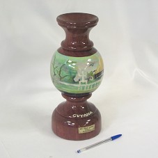 VASO DECORATIVO (33 CM), EM MADEIRA ROXEADA E ENVERNIZADA. POSSUI BOJO ABAULADO COM PINTURA DE UMA PAISAGEM. NA BASE, A INSCRIÇÃO 'GUYANA' E PLACA COM A GRAVAÇÃO 'RIO GROUP SUMMIT / 2007 / GUYANA'. ACOMPANHA CARTÃO COM A INSCRIÇÃO 'WITH THE GOOD WISHES OF THE PRESIDENT'.