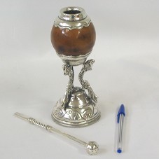 CUIA DE CHIMARRÃO, EM CABAÇA ENVERNIZADA, FIXADA EM BASE DE PRATA 900 (19 CM). ACOMPANHA BOMBA EM PRATA. NO BASTÃO E NA BASE, A GRAVAÇÃO 'EC'. ACONDICIONADOS EM ESTOJO FORRADO DE NAPA PRETA.