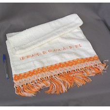 TOALHA DE ROSTO (90X45 CM) NA COR BRANCA, COM BARRA TRABALHADA EM TAPEÇARIA DE MOTIVOS FLORAIS, NAS CORES LARANJA E ROSA. POSSUI BORDADO COM A INSCRIÇÃO 'LEMBRANÇA DE CHAPADÃO DO SUL'.