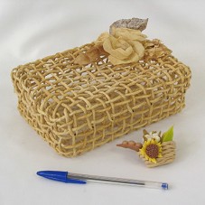 CAIXA (20X14,5X7 CM) CONFECCIONADA EM PALHA TRANÇADA E VAZADA. POSSUI NA TAMPA ARRANJO FLORAL DESIDRATADO. ACOMPANHA IMÃ DE GELADEIRA, EM BISCUIT, REPRESENTANDO UMA CESTA COM SEMENTES DE SOJA, MILHO E ALGODÃO.
