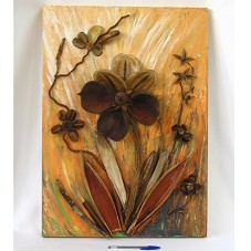 PINTURA SOBRE TELA (70X50 CM) COM FUNDO EM TONS DE LARANJA COM DETALHES VERDES. POSSUI MONTAGEM CONFECCIONADA COM FLORES, FRUTOS, CASCAS E SEMENTES SECOS, REPRESENTANDO UM ARBUSTO FLORAL. NO CANTO INFERIOR DIREITO, ASSINATURA DA ARTISTA 'AM VERZELONI'. ATRÁS, 'ANA MARIA VERZELONI / MINEIROS - GO / BRASIL'.