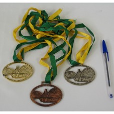 TRÊS MEDALHAS (5,5X7 CM), DE FORMATO OVAL, EM METAL, NAS CORES DOURADO, PRATEADO E COBRE, PRESAS, CADA UMA, A FITAS VERDE E AMARELA. POSSUI DESENHO DA 'PONTE JK', EM BRASÍLIA-DF, E A GRAVAÇÃO '6º CAMPEONATO BRASILEIRO DE KARATE-DO PROTECTOR / BRASÍLIA-DF 16 E 17/08/2003'. ACONDICIONADAS EM ESTOJO VERMELHO.