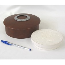 ESTOJO (18X18X6 CM) CIRCULAR, EM CERÂMICA PINTADA DE MARROM, COM DETALHE EM METAL PRATEADO NA TAMPA. ACONDICIONADA PLACA CIRCULAR (14X14X3 CM) EM RESINA BRANCA, COM A GRAVAÇÃO 'CEFET -GO / 2007' E LOGOMARCA. ACOMPANHA GUARDANAPO COM NOME DO AGENTE.