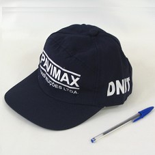BONÉ EM TECIDO AZUL MARINHO. NA FRENTE, EM BRANCO, 'PAVIMAX / CONSTRUÇÕES LTDA'. NAS LATERAIS, 'DNIT'.