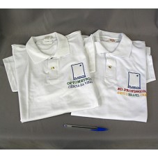 DUAS CAMISAS GOLA PÓLO (TAM G), NA COR BRANCA, DE MANGA CURTA. EM UMA DELAS, NO CANTO SUPERIOR DIREITO FRONTAL, BORDADO COM A INSCRIÇÃO 'FILADELFIA / OPTOMETRIA / CIÊNCIA DA VISÃO'; NA OUTRA, 'FILADELFIA / ED. PROFISSIONAL / AQUI O BRASIL CRESCE'.