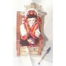 BONECO EM LOUÇA, COM TRAJES TÍPICOS DO PERU (CALÇA DE VELUDO PRETO E COLETE VERMELHO, COM DETALHES COLORIDOS CONTORNANDO A BARRA, BLUSA DE MANGAS COMPRIDAS BRANCA COM RENDA NO DECOTE E GORRO DE LÃ COLORIDA), COROA EM PRATA, CHORANDO, COM UM ESPINHO NO PÉ, SENTADO EM UMA CADEIRA (TRONO) DE MADEIRA ENTALHADA COM UMA PLACA EM METAL GRAVADA, EM PRETO, A INSCRIÇÃO 'XVII CUMBRE DE PRESIDENTES DEL GRUPO DE RIO - SAQSAYWAMAN 2003 - INSTITUTO NACIONAL DE CULTURA - CUSCO - PERU'. ACONDICIONADO EM ESTOJO DE VELUDO AZUL MARINHO COM A MESMA PLACA EM METAL, NA FRENTE.