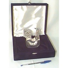 ESCULTURA (11X8,5X4 CM) CONFECCIONADA EM PRATA, EM FORMA DE AVE COM OLHOS DE PEDRA AZUL CLARO (BERILO). NA BASE, A GRAVAÇÃO 'ING. LUCIO GUTIERREZ BORBUA - PRESIDENTE DE LA REPUBLICA DEL ECUADOR'. ACONDICIONADA EM ESTOJO DE VELUDO AZUL MARINHO COM O EMBLEMA, EM PRATA, DO GOVERNO DO EQUADOR.