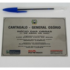 PLACA (10X15 CM) EM METAL ESCOVADO, CONTENDO A GRAVAÇÃO 'CANTAGALO - GENERAL OSÓRIO / INÍCIO DAS OBRAS 11 DE ABRIL DE 2007 / PRESIDENTE DA REPÚBLICA LUIZ INÁCIO LULA DA SILVA / GOVERNADOR DO ESTADO DO RIO DE JANEIRO SERGIO CABRAL / MINISTRO DOS TRANSPORTES ALFREDO NASCIMENTO / SECRETÁRIO DE ESTADO DE TRANSPORTES JÚLIO LOPES'. ACONDICIONADA EM ESTOJO FORRADO DE AZUL MARINHO.
