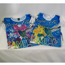 QUATRO CAMISETAS (TAM M, G E GG) DE MANGA CURTA. TODAS COM FUNDO AZUL FLORAL, TENDO NA FRENTE, DESENHO DE UM BEIJA-FLOR E A INSCRIÇÃO 'BEIJA-FLOR DE NILÓPOLIS / CAMPEÃ 2007 / TORCIDA OFICIAL'. DUAS DELAS COM UMA FLOR DE HIBISCO AMARELO PERTO DA AVE; E, AS OUTRAS DUAS, COM UMA DE COR ROSA. ATRÁS, 'CAMPEÃ CARNAVAL 2007' E DESENHOS.