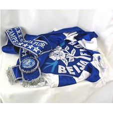 ESTANDARTE DA ESCOLA DE SAMBA BEIJA-FLOR DE NILÓPOLIS, EM TECIDO AZUL E BRANCO, TENDO, AO CENTRO, A LOGOMARCA DA INSTITUIÇÃO, COM A INSCRIÇÃO 'G.R.E.S. BEIJA-FLOR'. POSSUI EXTREMIDADES ARREMATADAS COM FRANJAS BRANCAS. ACOMPANHA FAIXA EM TECIDO AZUL, COM A INSCRIÇÃO 'G.R.E.S. BEIJA-FLOR DE NILÓPOLIS / CAMPEÃ / (E OS ANOS EM QUE FOI CAMPEÃ), UNIDA POR ROSETA COM LOGOMARCA E NOME DA ESCOLA DE SAMBA.