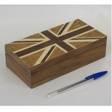 ESTOJO EM MADEIRA (5,5X20X10 CM), COM A PARTE SUPERIOR DA TAMPA TRABALHADA EM MARCHETARIA, POSSUINDO DESENHO DA CRUZ DA BANDEIRA DA INGLATERRA. ACOMPANHA PAPEL COM INFORMATIVO DO FABRICANTE. ACONDICIONADO EM CAIXA DE PAPELÃO, COM NOME DO FABRICANTE NA TAMPA.