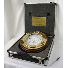 RELÓGIO DE NAVIO (33X33 CM), DE FORMATO CIRCULAR, COM MOLDURA EM MADEIRA E METAL DOURADO. POSSUI ACABAMENTO COMO ESCOTILHA DE NAVIO. ALÉM DE RELÓGIO, POSSUI MAIS TRÊS FUNÇÕES: HIGRÔMETRO, BARÔMETRO E TERMÔMETRO. ACONDICIONADO EM MALETA METÁLICA PRETA E PRATEADA, ONDE HÁ, NA PARTE INTERNA, PLACA COM A INSCRIÇÃO 'AO COMANDANTE LULA, QUE TORNOU REALIDADE O SONHO DE MILHARES DE BRASILEIROS: O RENASCIMENTO DA INDÚSTRIA NAVAL NO PAÍS. LEVANTAR ÂNCORAS, BRASIL. ACELERANDO O CRESCIMENTO DO PAÍS. / BR PETROBRÁS / PETROBRÁS TRANSPORTES S.A. TRANSPETRO'. ACOMPANHA TRÊS FOLHETOS EXPLICATIVOS E DUAS CHAVES PEQUENAS (DA MALETA).
