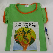 CAMISETA (TAM G) EM MALHA VERDE, DE MANGA CURTA. NA FRENTE, ESTAMPA COM A INSCRIÇÃO '1º FESTIVAL NACIONAL DA JUVENTUDE RURAL / BRASÍLIA 2007', E DESENHO EM TONS DE LARANJA E VERDE, MOSTRANDO DUAS PESSOAS ESTILIZADAS SEGURANDO UMA ESFERA (MUNDO) COM DIVERSOS DESENHOS DE FIGURAS HUMANAS ESTILIZADOS. ATRÁS, NOMES E LOGOMARCAS DAS INSTITUIÇÕES DE REALIZAÇÃO E APOIO.