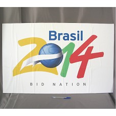 CARTAZ (59,5X95,5 CM) IMPRESSO EM PAPEL BRANCO, POSSUINDO A INSCRIÇÃO 'BRASIL 2014 / BID NATION'. CARTAZ EM ALUSÃO À COPA DO MUNDO EM 2014, ONDE O ZERO É REPRESENTADO POR UMA BOLA, COM UMA FAIXA BRANCA (COMO A BANDEIRA NACIONAL) NO CENTRO.