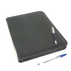 PASTA EM COURO PRETO (34X26 CM), COM FECHAMENTO EM ZÍPER E BOLSOS INTERNOS. NA FRENTE, A INSCRIÇÃO 'POR LA UNIÓN DEL SUR / 1RA. CUMBRE ENERGÉTICA SURAMERICANA / VENEZUELA 2007'. ACOMPANHA CANETA ESFEROGRÁFICA PRETA, COM CORPO EM METAL PRATEADO E BORRACHA AZUL MARINHO, COM MESMA INSCRIÇÃO.