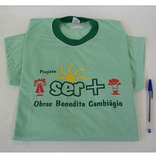 CAMISETA (TAM G) EM MALHA VERDE, DE MANGA CURTA. NA FRENTE, ESTAMPA COM A INSCRIÇÃO 'PROJETO SER + / OBRAS BENEDITA CAMBIÁGIO'. ATRÁS, 'OBRAS BENEDITA CAMBIAGIO GAMA-DF / FONE: 3964-0097'.