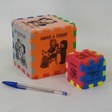 DOIS CUBOS PEDAGÓGICOS (6,5X6,5X6,5 E 12X12X12 CM), EM PLACAS DE EVA COLORIDAS, TENDO EM CADA FACE ESTAMPA E FRASE DIFERENTES, SOBRE AMOR E SOLIDARIEDADE.