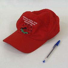 BONÉ EM TECIDO VERMELHO. NA FRENTE, BORDADO EM BRANCO 'ARTICULAÇÃO DOS POVOS INDÍGENAS REGIÃO SUL'. E, EM PRETO E VERDE, LOGOMARCA.